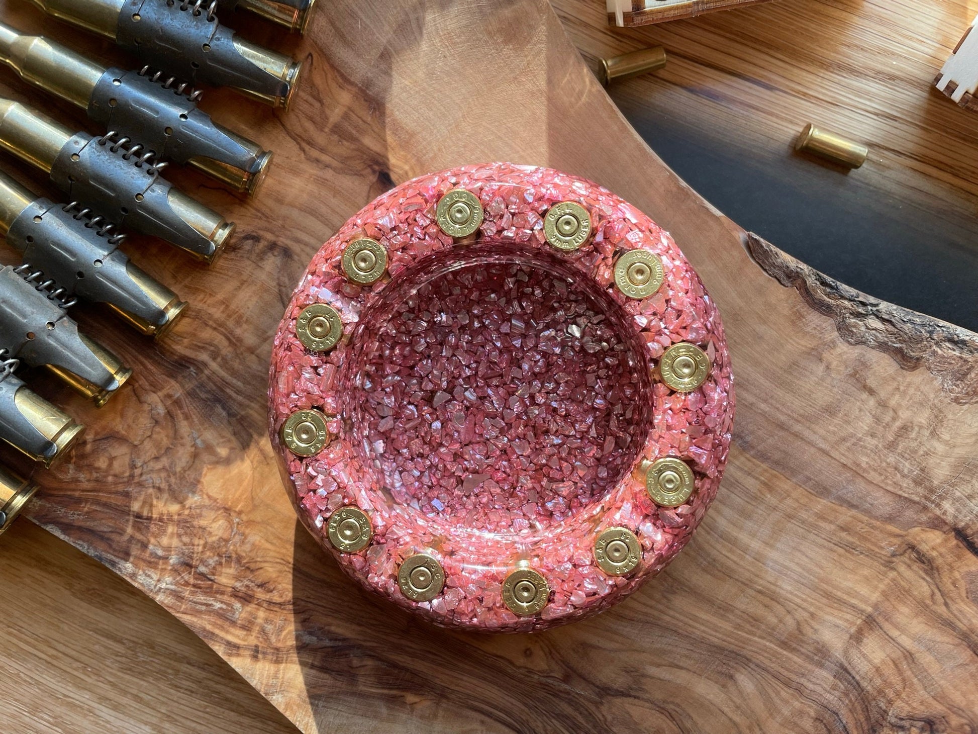 Aschenbecher aus Epoxidharz mit Patronenhülsen.