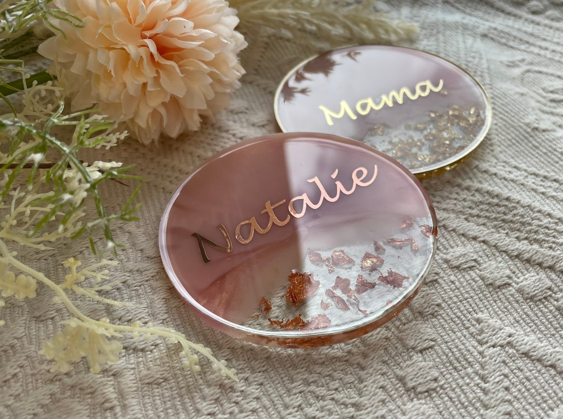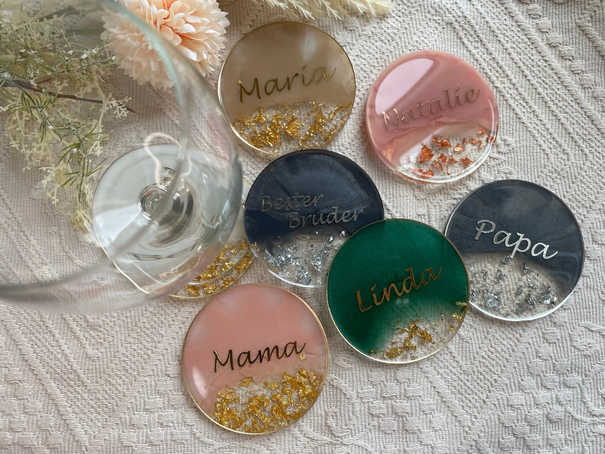 Untersetzer aus Epoxidharz mit Personalisierung.