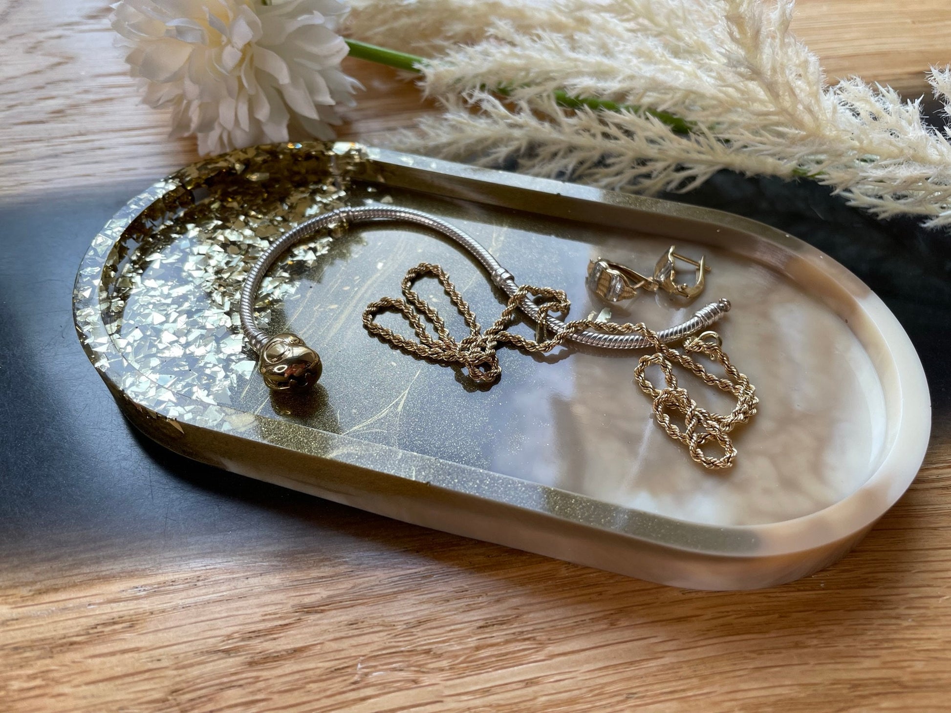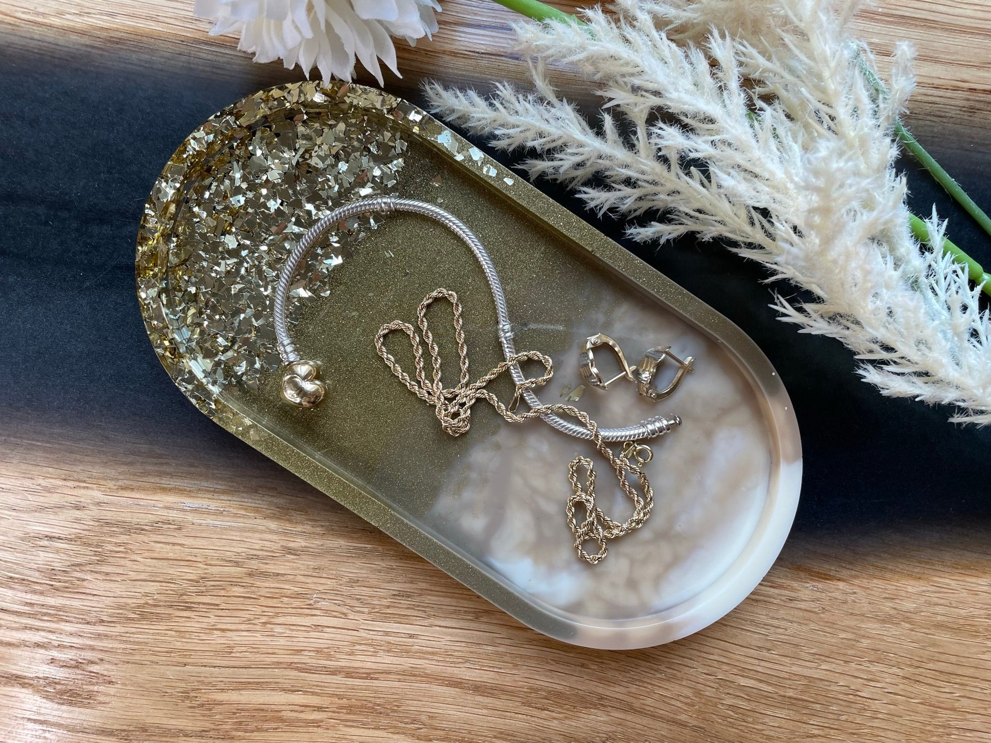 Schmuckschale / Tray / Marmor / Schale / Ringschale / Tablett / Seifenschale / Epoxidharz / Resin / Gold / Glitzer / Beige
